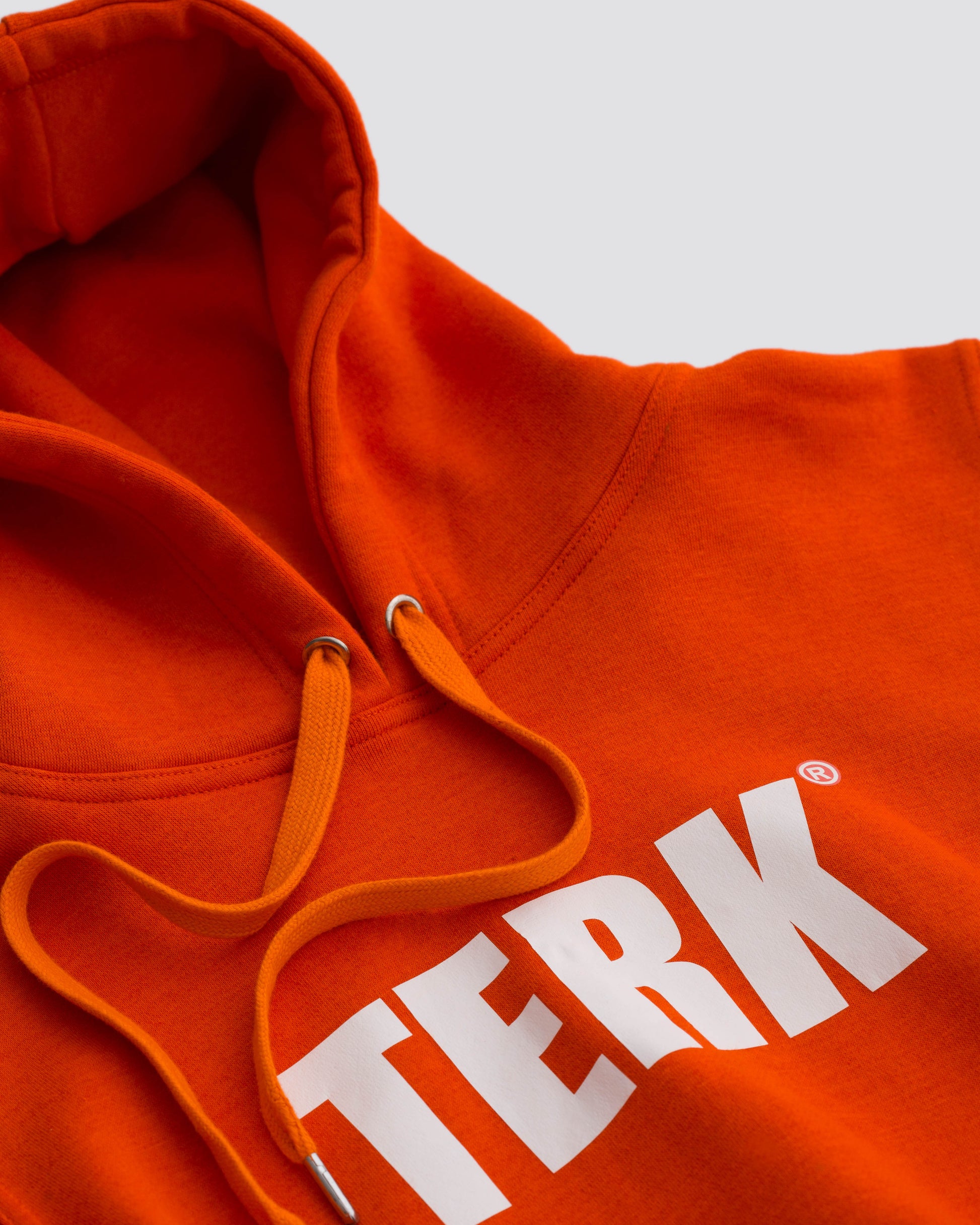 ORANGE TERK WOMEN'S SPORTSWEAR RALLY ELASTIC CROPPED HOODIE 100% ORANGE cotton RALLY CROPPED HOODIE featuring our WHITE WORDING logo screen print on the chest with red drawstrings.